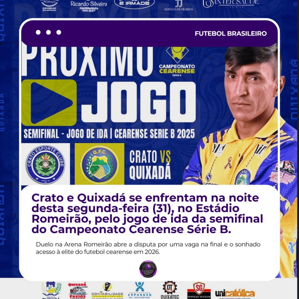 A semifinal da Série B tem um peso especial, pois os finalistas garantem automaticamente o acesso à primeira divisão do Campeonato Cearense. Com isso, o confronto entre Crato e Quixadá se torna ainda mais decisivo, já que quem avançar voltará a disputar a elite do futebol estadual em 2026. O duelo de ida será na Arena Romeirão, às 20h00 e com transmissão da FCF TV no Youtube. A partida promete fortes emoções, com uma vaga na final e o acesso em jogo.