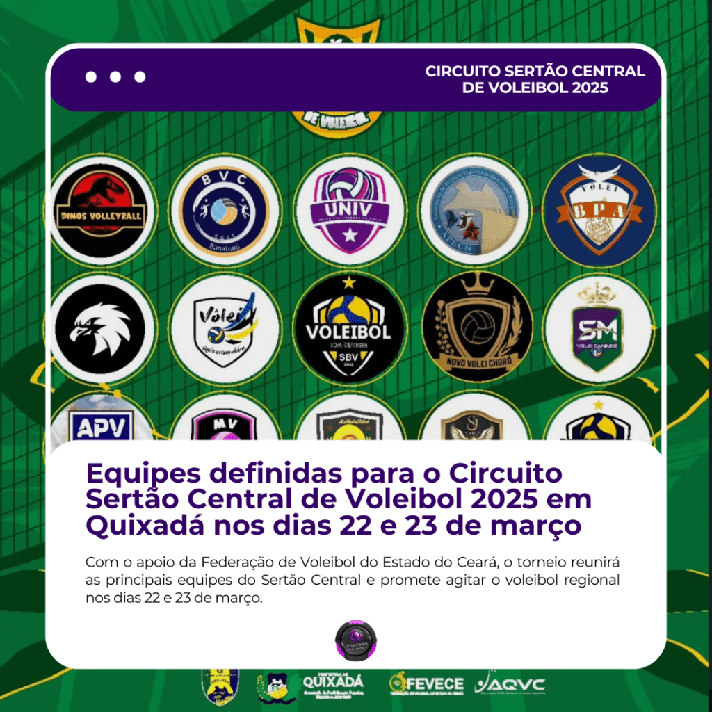 As equipes que disputarão o Circuito Sertão Central de Voleibol 2025 em Quixadá já estão definidas, e a expectativa para o torneio é alta. Com o apoio da Federação de Voleibol do Estado do Ceará (FEVECE), o evento ocorrerá nos dias 22 e 23 de março, reunindo as principais equipes da região em uma competição que promete proporcionar alto nível técnico e grandes emoções para os fãs da modalidade. A cidade de Quixadá se prepara para viver dias intensos de esporte, com a presença de atletas de destaque e a realização de partidas disputadas.