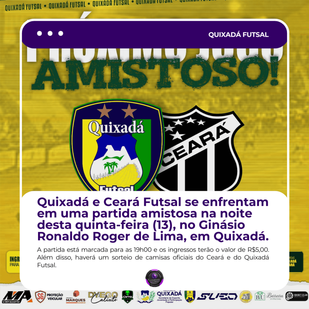 Não perca a chance de viver uma noite inesquecível de futsal em Quixadá. O amistoso entre Quixadá Futsal e Ceará Futsal promete trazer muita emoção e grandes lances para os torcedores. Com ingressos acessíveis e o sorteio de camisas oficiais, o evento se torna uma ótima oportunidade para apoiar o futsal local e celebrar a paixão pelo esporte. Marque na sua agenda: quinta-feira (13), às 19h00, no Ginásio Rinaldo Roger de Lima. Nos vemos lá!