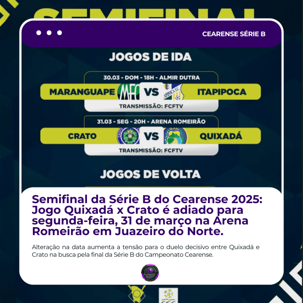 A Série B do Campeonato Cearense 2025 está chegando à sua fase mais emocionante. Com as semifinais à vista, os times estão se preparando para batalhas intensas em busca do tão sonhado acesso à elite do futebol cearense. Um dos confrontos que tem gerado grande expectativa é o duelo entre Quixadá e Crato, que promete agitar a torcida. Contudo, uma mudança de data deixou os ânimos ainda mais aquecidos para o jogo decisivo.