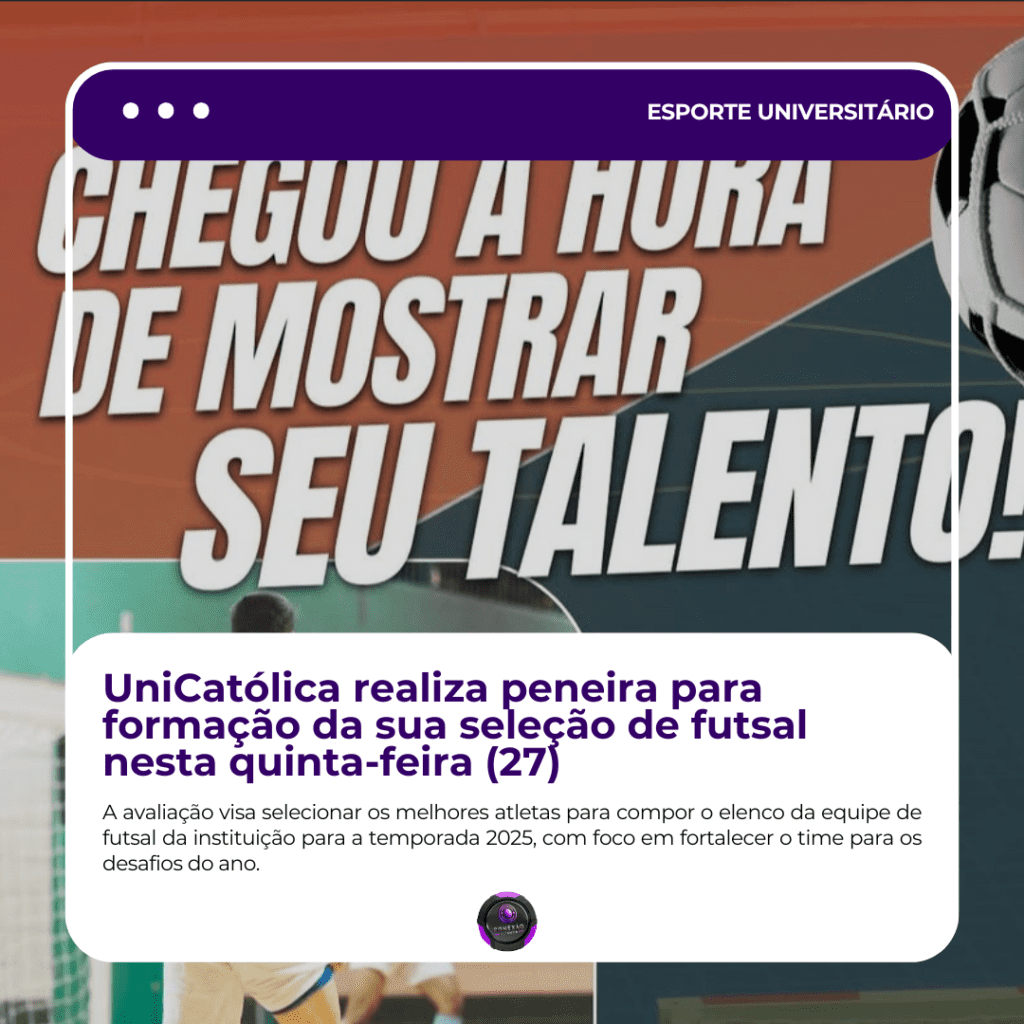 A peneira é aberta a atletas que desejam representar a UniCatólica nas competições de futsal programadas para o ano de 2025. A seleção buscará jogadores com habilidades técnicas, táticas e físicas, além de um bom desempenho dentro e fora de quadra. A participação na avaliação é uma excelente oportunidade para aqueles que têm o sonho de fazer parte de um time de futsal universitário, com o suporte de uma instituição que valoriza tanto a educação quanto o esporte.